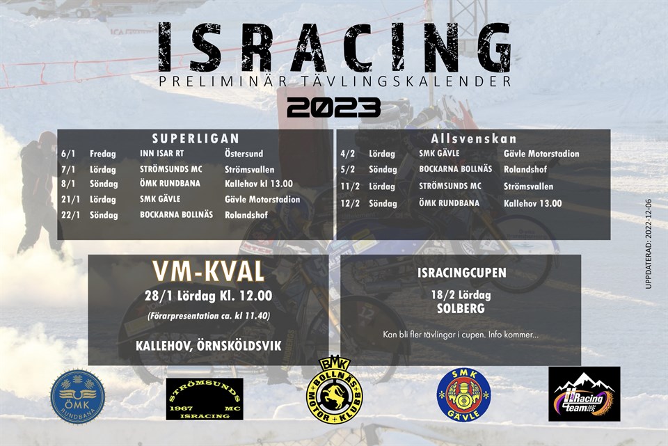 VM-KVAL - FIM Ice Speedway World Championship Qualifying Round. ÖMK Rundbana kan nu med glädje meddela att vi fått äran att återigen få arrangera denna populära tävling. Datum: Lördag 28 januari 2023 Tid: 12.00 (förarpresentation ca kl 11.40) Kom i tid! Plats: Kallehov (mitt emot Norrlands Custom) Sväng höger i norra rondellen mot Må Återvinningscentral. I korsningen innan tag vänster mot "Isracingbana". Sedan skyltat till parkering. Pris: 200 kr Under 16 år: Gratis OBS! Ej kortbetalning. Endast kontant eller Swish 16 förare världen över med olika nationaliteter kommer göra upp om ett visst antal platser till VM-serien 2022. 20 heat totalt med 4 förare som möts i varje. Ettan får 3 poäng, tvåan 2 poäng, trean 1 poäng och fyran får 0 poäng. Känn metanoldoften, vrålet från cyklarna och taggade förare! Försäljning av hamburgare, korv, fika mm. Välkomna på årets mest spännande och viktiga race i Örnsköldsvik! Vänligen ÖMK Rundbana Styrelse Bild: Roffe Lundstedt Visa mindre