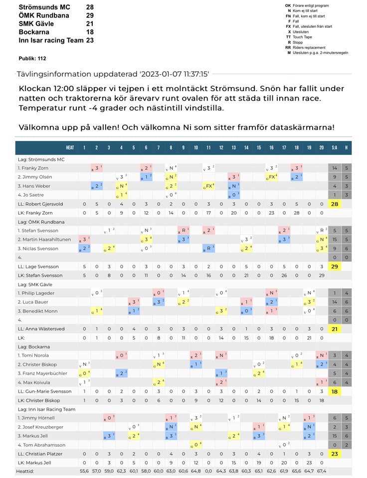 SUPERLIGAN rond 3/5 avgjord! Vilken dag! Snöigt, blåsigt och blött - men VI GJORDE DET! Alla ni fina supportar som trotsade vädret för isracing på Kallehov - en stor ELOGE till er! Publiksiffra: 315. Vi är så tacksamma för detta. Det glädjer oss att se och ni är varmt välkomna tillbaka den 28/1 för ett spännande VM-kval på Kallehov. Då beställer vi ett lugnare väder va? Grattis säger vi till vårt ÖMK Rundbana som kammade hem 3:e raka vinsten denna helgen. Stefan Svensson, Martin Haarahiltunen och Niclas Svensson. Med ledning av lagledare Niclas Wattman. Starkt jobbat! ÖMK Rundbana Strömsund MC Inn Isar Racing Team Som tidigare nämnt - våra utlånade förare Jimmy Hörnell och Tom Abrahamsson tog hem tredjeplatsen med sitt tyska team. Grymt jobbat alla förare! Vi önskar Franky Zorn & Hans Weber god återhämtning efter fallet idag. Tack till Bilbolaget Örnsköldsvik som var på plats och visade sina fina Volvo bilar idag! Tack till dagens huvudpartners CF MOTO & Effekt Powerstore, som ni fick se på fyrhjuling och släde som bärgare. Även ”fulmössorna” kom CF MOTO med till vinnande laget. Stiligt! Tack till alla journalister som var på plats! Ni gör ett otroligt viktigt jobb för denna sporten. Tack till våra partners som stöttar oss under säsongen! Tack eventsjukvårdarna i Ambulans 104 AB! Tack tävlingsledning, traktorförare, speaker, domare och alla funktionärer för det jobb ni gör! En väl genomförd tävling trotts omständigheterna - vilket TEAM! ❤️ Fullständigt resultat från dagens tävling: 👇 Poäng SUPERLIGAN rond 3/5 Nu siktar vi mot VM-kvalet 28/1 kl 12.00! Det kommer bli en tuff fight om de 10 fömsta platserna till Vm-serien 2023 🔥🔥 Välkomna!!