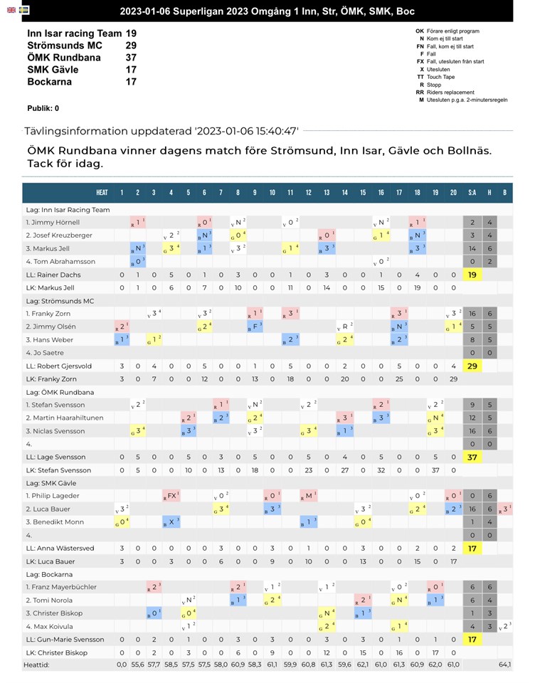 ISRACINGPREMIÄR 2023! SUPERLIGAN Söndag 8/1 kl 13.00 (förarpresentation ca 12.45) Vi laddar upp med en het tävling inför stundande VM-kvalet 28/1. Nytt detta år är denna SUPERLIGA-serie. Den består av 5 lag (ÖMK Rundbana, Bockarna Bollnäs, SMK Gävle, Strömsund MC och Inn Isar Racing Team). Här är det par-körning som gäller. Närmare info om detta finner ni längre ned. Kom och se VÄRLDSMÄSTAREN Martin Haarahiltunen fajtas med sitt lag ÖMK Rundbana. Vilka fler ni kommer se i laget får ni se inom kort. Vi laddar upp med en het tävling inför stundande VM-kvalet kommande helg. Pris: 100 kr Barn & ungdomar under 20 år - gratis. Försäljning av hamburgare, korv, fika mm. Kontanter eller Swish Varmt välkomna! __________________________________________________________ Närmare information gällande SUPERLIGAN: Vi kommer i år vara en del av superligan. Ett koncept som innebär att varje lag tar ut sina 3 främst rankande förare som kommer representera vardera klubb. Sedan är det par-körning som gäller. 2 lag möts under 20 heat där 2 förare från vardera klubb möts. Poängsättningen är detsamma - men här gäller det att vara taktisk och smart som lag. Ett tävlingsupplägg som blir spännande på ett annat sätt. Spännande att följa (Samma upplägg som ett Lag-VM) Tanken med denna serie är att det ska vara tufft motstånd med en bra träning och vara avgjord inför VM-kval och VM-serien. Välkomna säger vi till det tyska laget Inn Isar Racing Team som i år kommer ställa upp med ett lag i Superligan! De kommer arrangera tävling i Östersund på Lukashov. Mycket roligt!